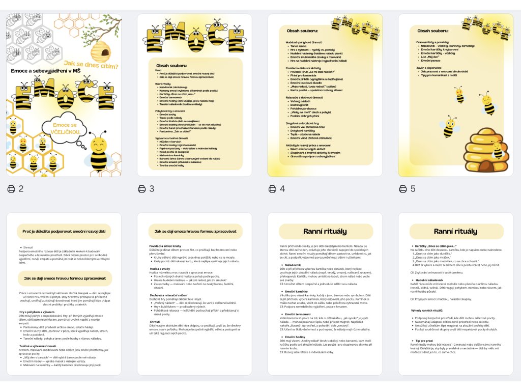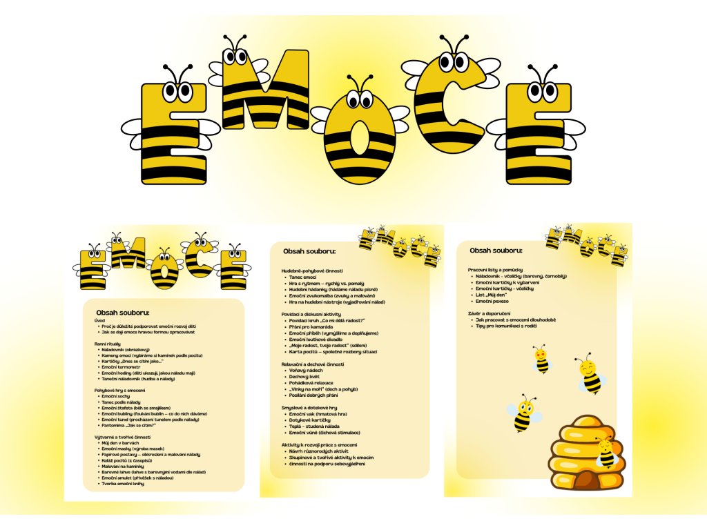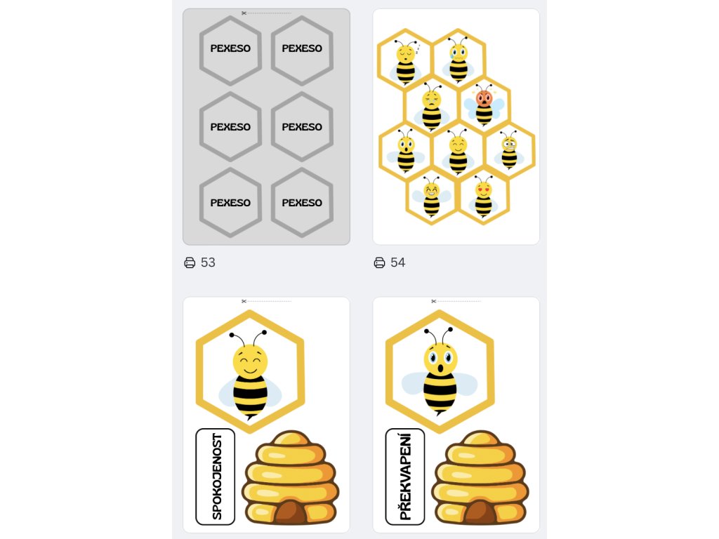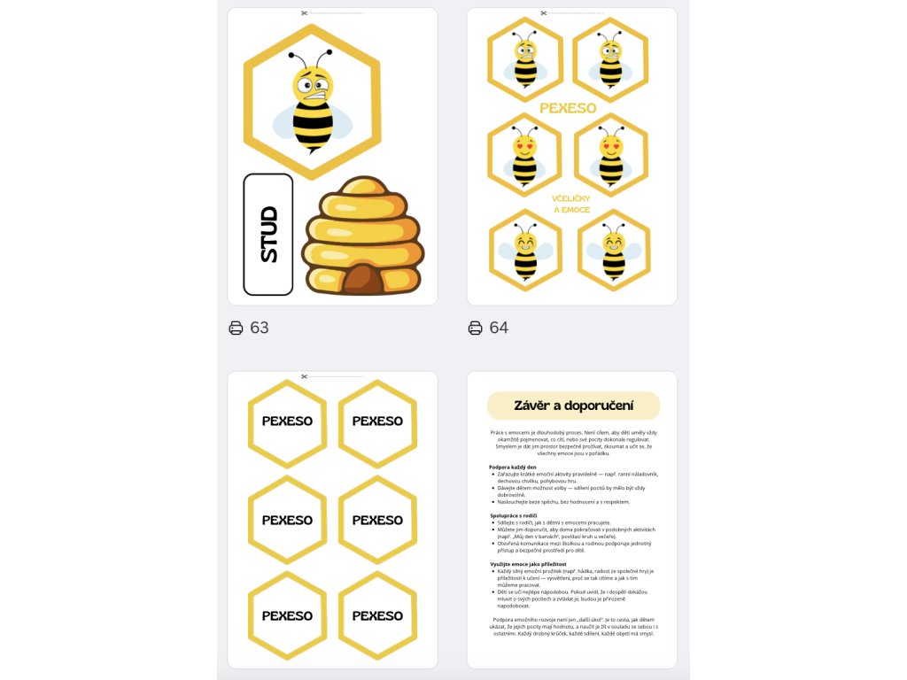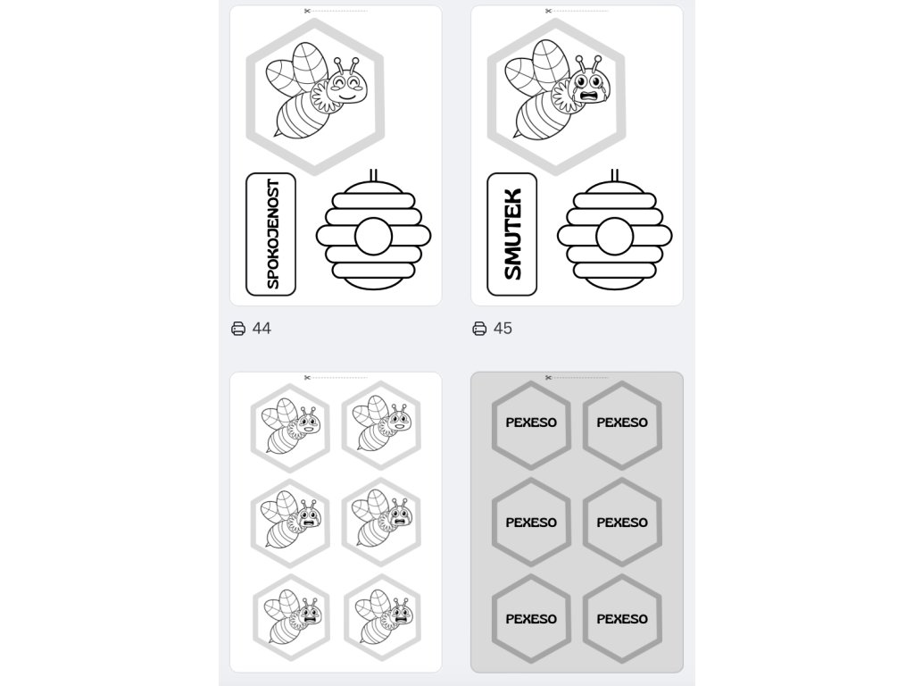 b) Pracovní listy a přílohy - omalovánky včeliček, Pexeso se včelkami (barevné, černobílé), Karty emocí a pocitů (včeličky: barevné, černobílé), pracovní listy- jak se dnes cítím, Náladovník k tisku se včelkami (barevný, černobílý)