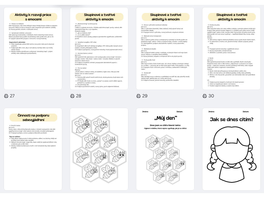 a) Metodické části: Ranní rituály, Pohybové hry s emocemi, Výtvarné a tvořivé činnosti, Hudebně-pohybové činnosti, Povídací a diskusní aktivity, Relaxační a dechové činnosti, Smyslové a dotekové hry, Venku a v přírodě, hravé aktivity a smyslové tvoření, aktivity pro Podporu sebevyjádření