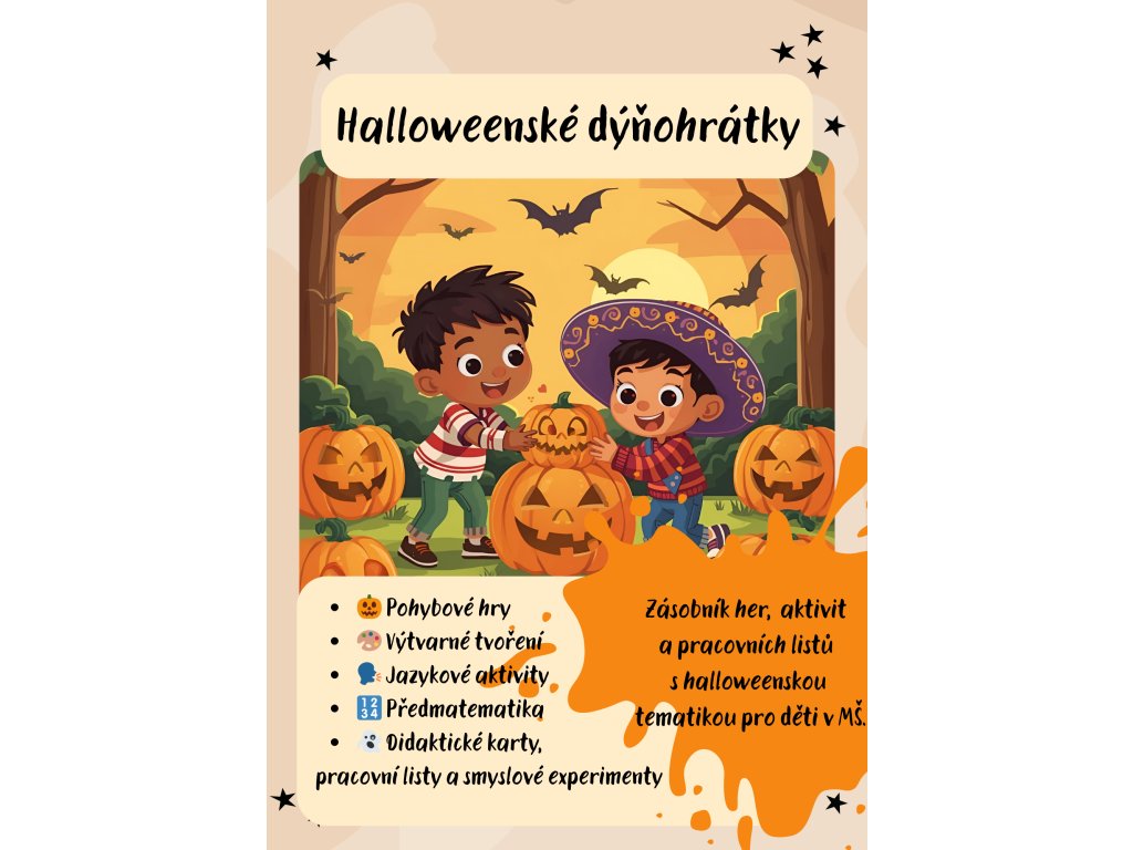 Soubor přináší bohatý zásobník her, aktivit a pracovních listů s halloweenskou a dýňovou tematikou. Vše je připraveno tak, aby rozvíjelo děti v různých oblastech a zároveň jim přinášelo radost a zábavu.