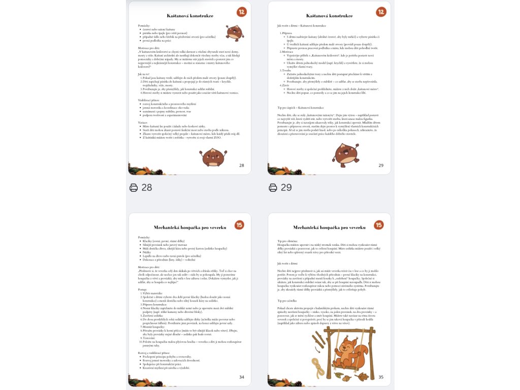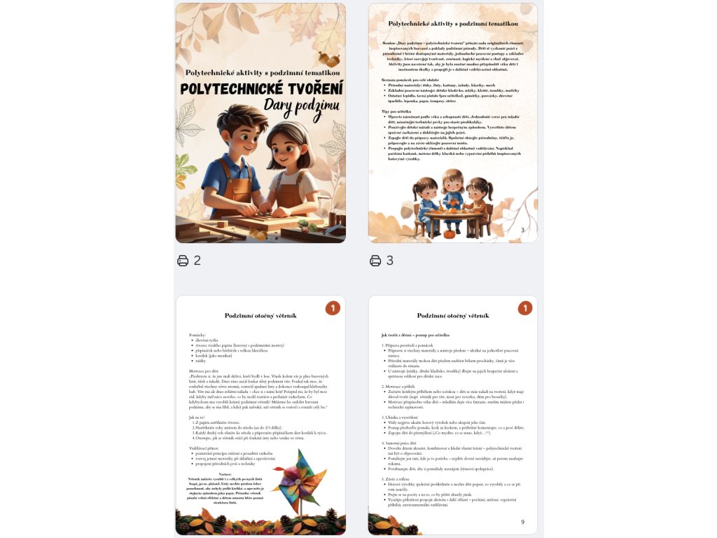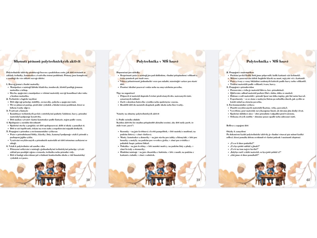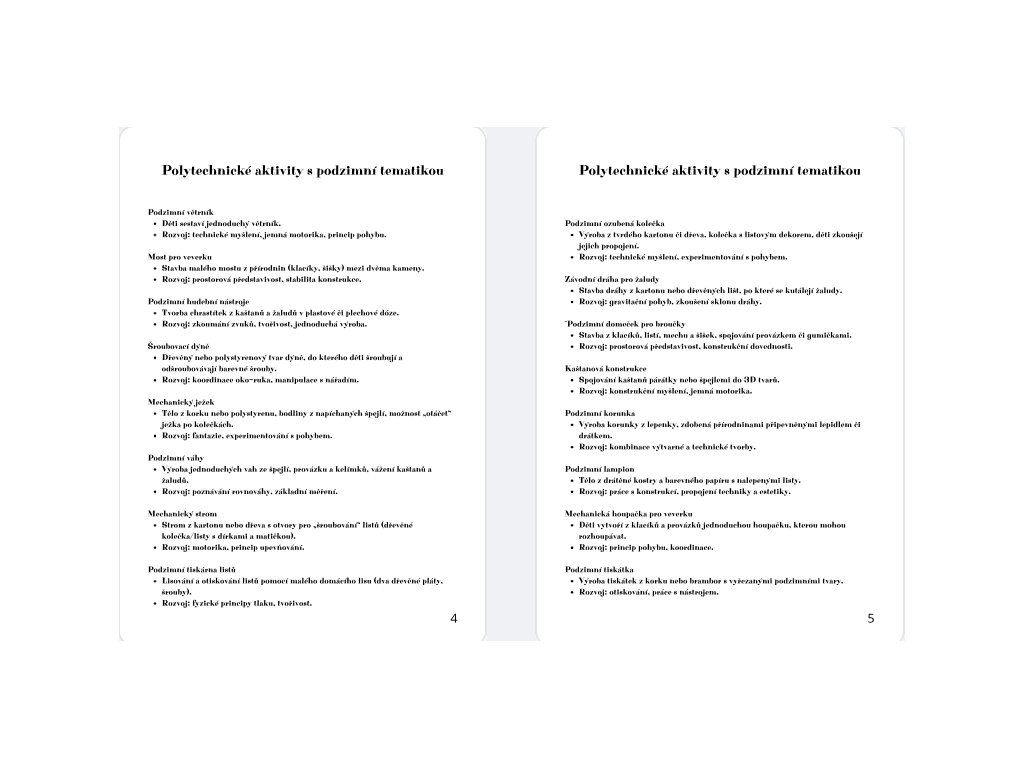 - polytechnické aktivity s podzimní tematikou, které jsou přizpůsobené pro práci s dětmi v mateřské škole, školní družině či na kroužcích. Aktivity jsou koncipovány tak, aby rozvíjely jemnou i hrubou motoriku, technické myšlení, tvořivost a logiku, a přitom byly zábavné a motivační.
