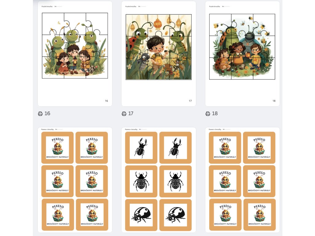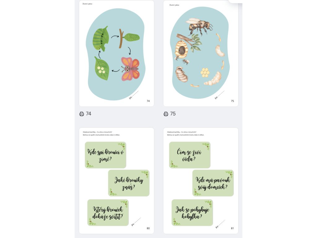 ✔️ Didaktické kartičky – pexeso, puzzle, spojovačky, otázkové karty, pohybové karty, životní cyklus hmyzu.