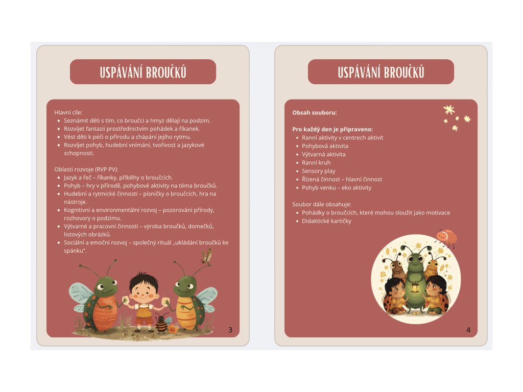 Chcete s dětmi zažít kouzelný podzim plný příběhů, her a tvoření? Připravila jsem pro Vás kompletní soubor s 83 stranami aktivit, příprav a didaktických kartiček, který Vás provede celým týdnem na téma Uspávání broučků.